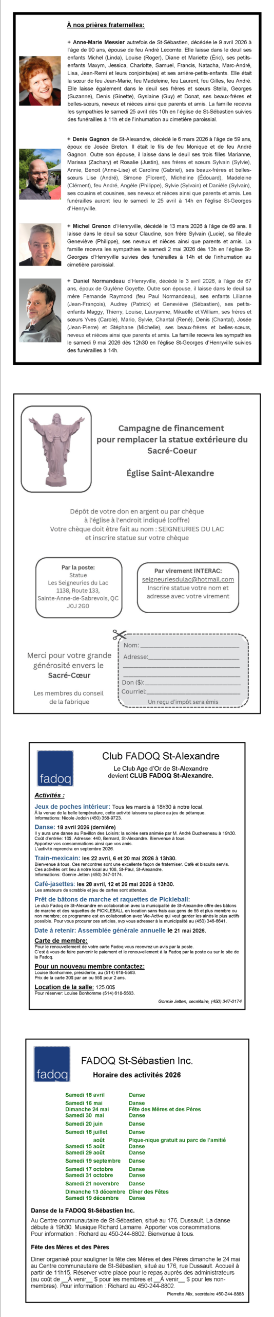 - Campagne de financement pour remplacer la statue extérieure du Sacré-Cœur de l’église de St-Alexandre