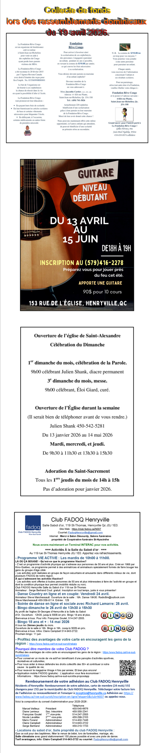 - Guitare niveau débutant à l’église d’Henryville tous les lundis jusqu’au 15 juin à 18h à 19h