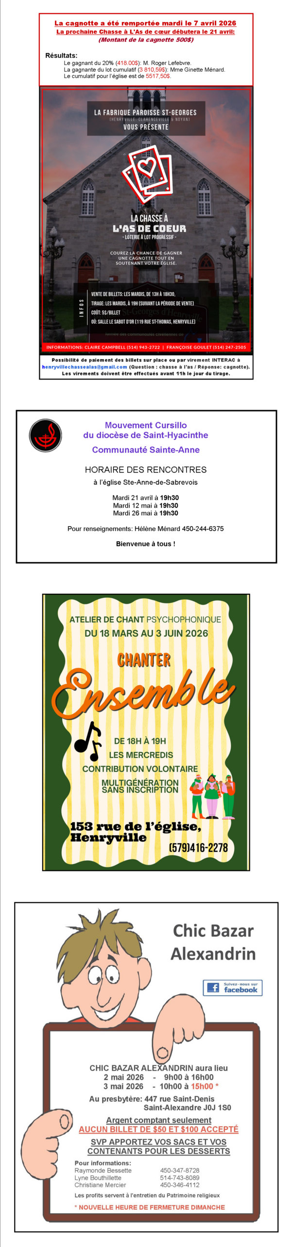 - Chasse à l’As de cœur de la paroisse St-Georges d’Henryville a été gagné! Nouveau tirage à la Salle du Sabot d’Or les mardis dès le 21 avril – Vente de billets de 13h à 18h30 et tirage à 19h