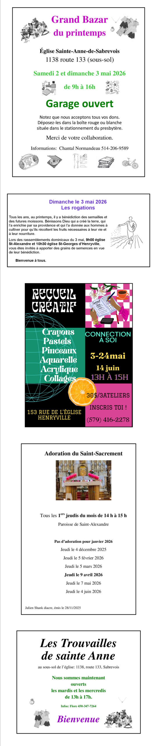 - Bazar du printemps au sous-sol de l’église Ste-Anne-de-Sabrevois le samedi 2 mai de 9h à 16h et le dimanche 3 mai de 9h à 16h